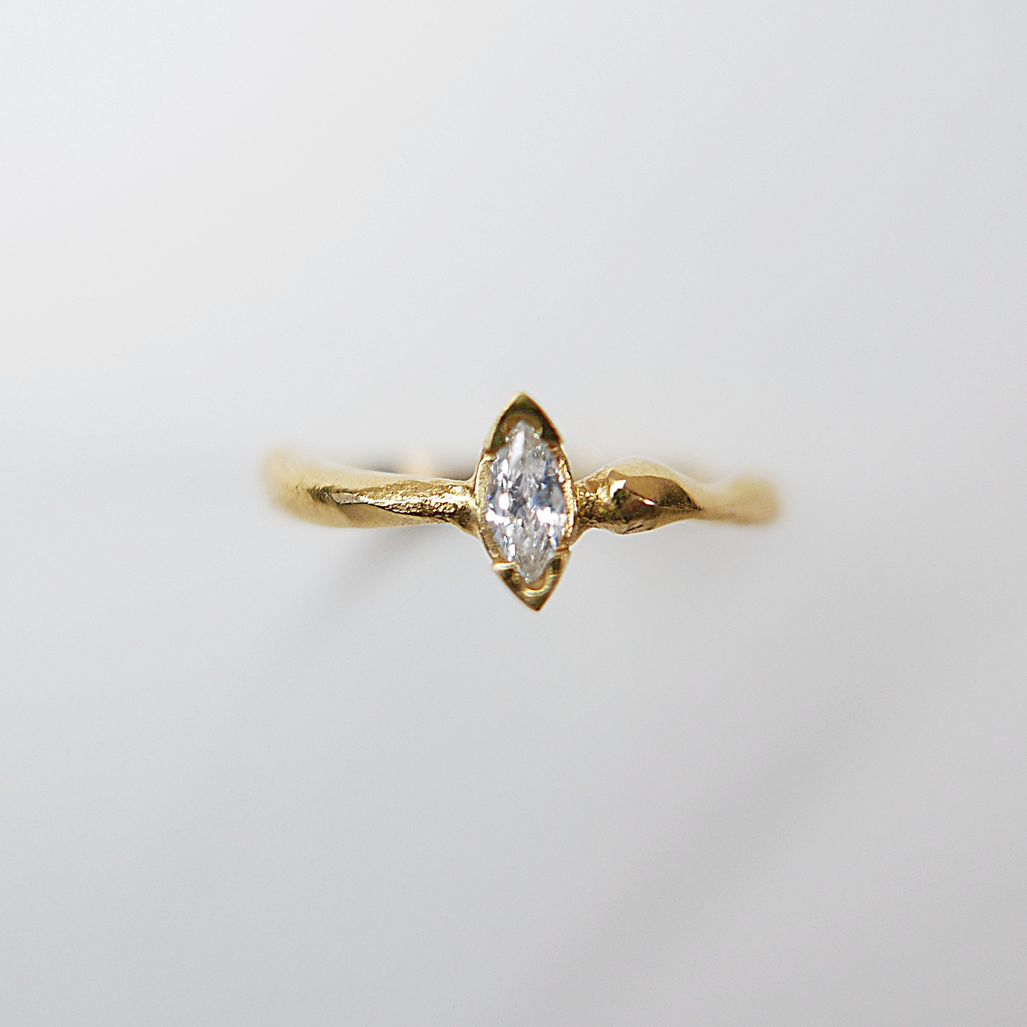 Verlovingsring met 0,25Ct lab-grown, markies cut. Zacht grillige band met matte afwerking.